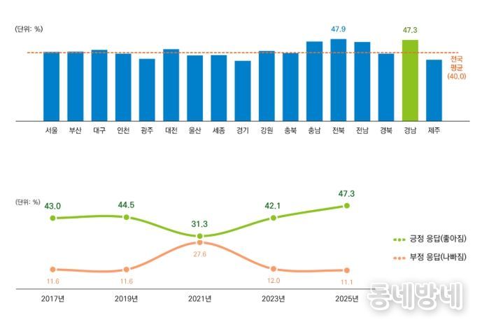 동네방네 김형규 기자 | 경남연구원은 국가데이터처 사회조사 자료를 활용해 경상남도 도민의 생활여건 변화와 정책 체감도를 종합적으로 분석한 ‘경남도민의 삶은 어떻게 달라졌나: 사회조사로 본 경상남도 생활여건 변화’ 이슈리포트를 발간했다.