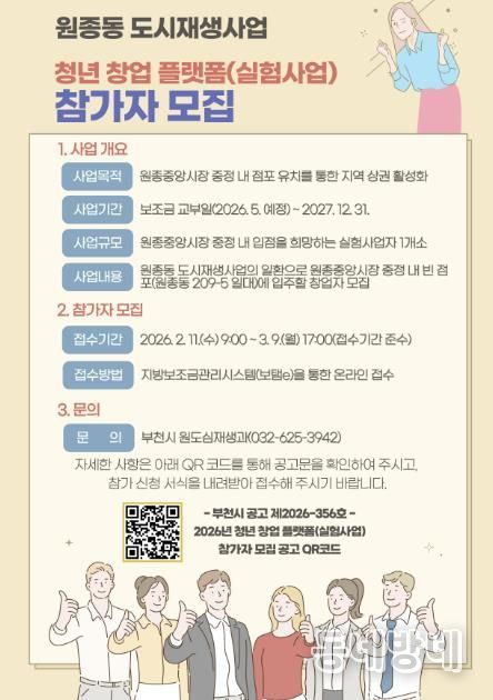 박희정 부천시 원도심재생과장은 “청년 창업 플랫폼은 도시재생을 통해 청년의 아이디어가 실험에 그치지 않고 지역과 함께 성장하도록 연결하는 사업”이라며 “창의적인 아이디어를 가진 청년들의 많은 관심과 참여를 기대한다”고 말했다.