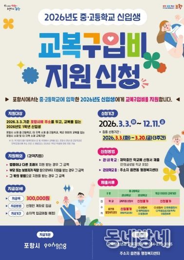 동네방네 김형규 기자 | 포항시는 교육의 공공성 강화와 학부모 교육비 부담 완화를 위해 2026학년도 중·고등학교 신입생 교복 구입비 지원 신청을 내달 3일부터 접수한다.