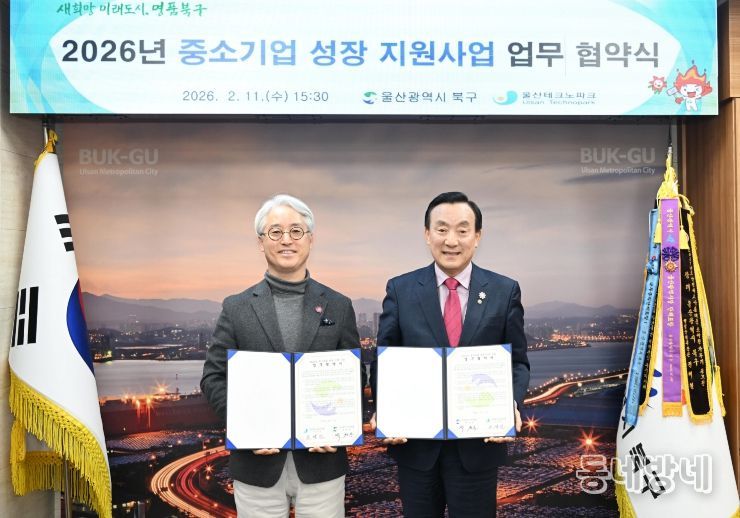 동네방네 김형규 기자 | 울산 북구는 11일 구청장실에서 울산테크노파크와 2026년 중소기업 성장 지원사업 업무협약을 체결했다.