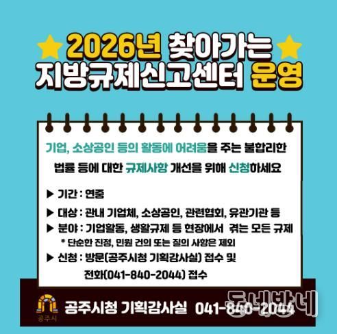 동네방네 김형규 기자 | 공주시는 2월부터 ‘찾아가는 지방규제 신고센터’를 연중 운영한다고 밝혔다.