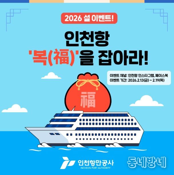 동네방네 김형규 기자 | 인천항만공사는 2026년 설 명절을 맞아 공식 SNS 채널(인스타그램, 페이스북)을 활용한 참여형 이벤트 “인천항 복(福)을 잡아라”를 진행한다고 12일 밝혔다.
