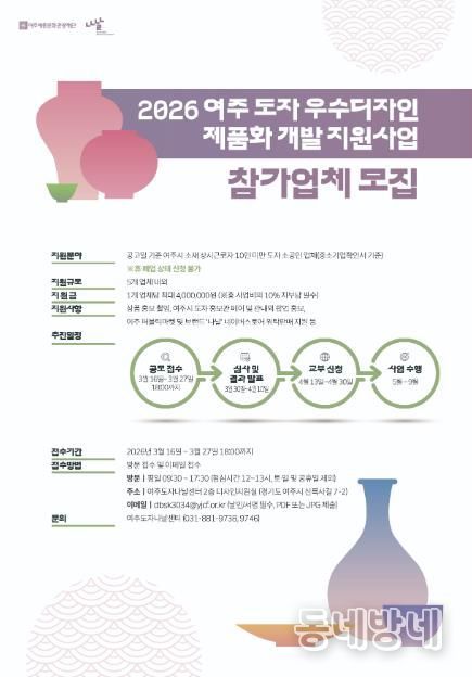 동네방네 김형규 기자 | 여주세종문화관광재단은 여주 도자 공동브랜드 ‘나날(Nanal)’에 부합하는 우수 디자인 제품을 발굴하고 도자 소공인의 경쟁력을 강화하기 위해 ‘2026년 여주 도자 우수디자인 제품화 개발 지원사업’참가업체를 모집한다고 밝혔다.