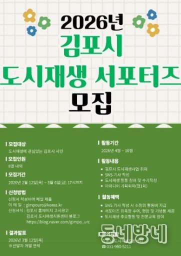 동네방네 김형규 기자 | 김포시는 다양한 도시재생사업을 홍보하고 도시재생에 대한 시민들의 이해와 관심을 도모하고자 오는 12일부터 ‘2026년 김포시 도시재생 서포터즈’를 모집한다.