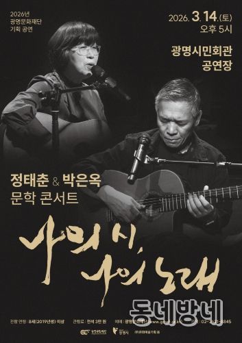 동네방네 김형규 기자 | (재)광명문화재단은 오는 3월 14일 오후 5시 광명시민회관 공연장에서 한국 포크 음악을 대표하는 정태춘·박은옥의 문학 콘서트 '나의 시, 나의 노래'를 개최한다.