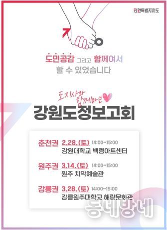 동네방네 김형규 기자 | 강원특별자치도지사는 2026년도 도정운영방향에 부합하는 도민 중심 공감행정을 실현하기 위해'“도지사와 함께하는”♥ 강원도정보고회'를 개최한다고 밝혔다.