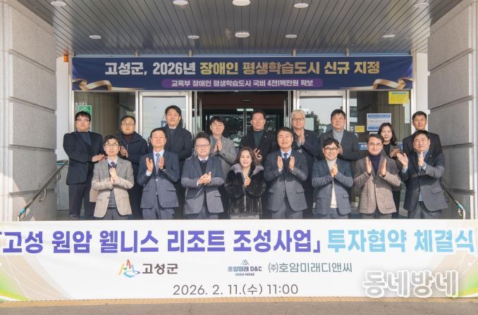 동네방네 김형규 기자 | 평화 경제 거점 도시 강원 고성군은 2월 11일 군청 본관 회의실에서 ㈜호암미래디앤씨(대표 전은영)와 '고성 원암 웰니스 리조트 조성사업' 투자 협약식을 체결했다고 밝혔다.