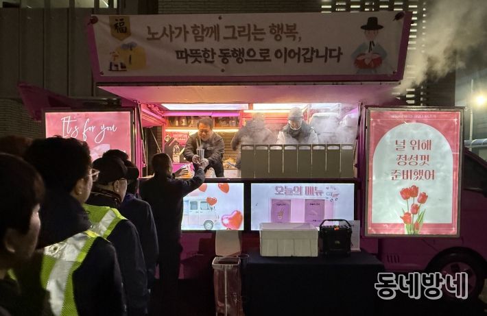 공단은 지난 12일 새벽부터 근무 중인 생활환경팀과 자원순환팀 근로자 200여 명을 대상으로 오전 5시30분부터 9시까지 푸드트럭을 통해 어묵과 물떡 세트를 제공하며 따뜻한 응원의 마음을 전했다. 특히 간식과 함께 노사상생을 상징하는 응원 메시지를 전달해 서로에 대한 신뢰와 존중을 바탕으로 한 건강한 노사 관계의 중요성을 강조했다.
