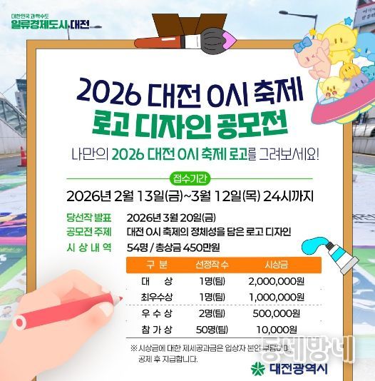 동네방네 김형규 기자 | 대전시는 올해 대중과의 소통을 강화하고 시민과 함께 만들어가는 축제를 구현하기 위해 ‘2026 대전 0시 축제 로고(EI) 디자인 공모전’과 ‘대전 상징 티셔츠 디자인 공모전’을 개최한다.
