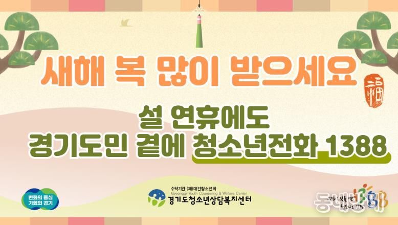 동네방네 김형규 기자 | 경기도는 설 당일을 포함해 14~18일 연휴 기간에도 위기 청소년 심리 상담 서비스 ‘청소년전화1388’을 24시간 운영한다.