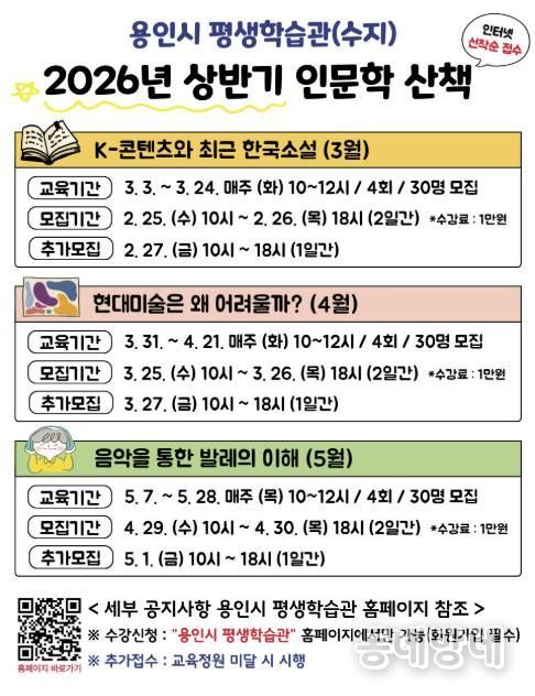 동네방네 김형규 기자 | 용인특례시는 25일부터 수지구에 있는 용인시평생학습관에서 인문학 산책 수강생을 모집한다고 13일 밝혔다.