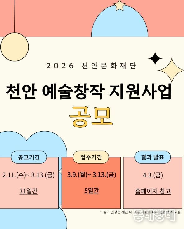 동네방네 김형규 기자 | (재)천안문화재단은 ‘천안 예술창작 지원사업’ 공모를 진행한다고 13일 밝혔다.