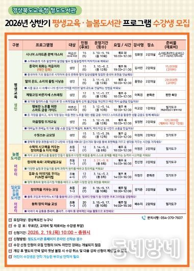 동네방네 김형규 기자 | 경상북도교육청 청도도서관(관장 조은희)은 2월 19일부터 지역주민을 대상으로 2026년 상반기 평생교육 및 늘봄도서관 프로그램 수강생을 모집한다.