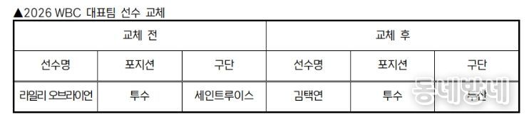 동네방네 김형규 기자 | KBO 전력강화위원회는 부상으로 인해 WBC 참가가 어려워진 세인트루이스 라일리 오브라이언을 대체할 선수로 두산 김택연을 확정하고 WBC 조직위에 선수 교체 승인을 요청했다.