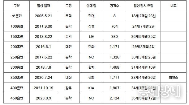 한 팀에서만 활약하며 매년 꾸준함으로 대기록 달성을 앞둔 최정은 지금과 같은 활약을 이어간다면 KBO리그 최초 개인 통산 500홈런 달성도 시간 문제일 것으로 전망된다.