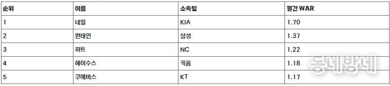 ‘쉘힐릭스플레이어’는 WAR(대체 선수 대비 승리 기여도)을 기반으로 선정하며, 3~4월 투수 부문에서는 KIA 네일이 WAR 1.70으로 1위를 차지했다. 네일은 평균자책점 1위(1.47), 다승 1위(4승), WHIP(이닝 당 출루 허용률) 2위(0.98)에 볼넷은 단 3개만 내주는 등 4월 중순부터 랭킹 상위권에 모습을 드러낸 이후 1위 자리를 줄곧 지켜왔다.