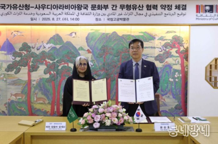 동네방네 김형규 기자 | 국가유산청은 8월 27일 오후 2시 국립고궁박물관(서울 종로구)에서 사우디아라비아 왕국 문화부와 한-사우디 무형유산 분야 연구교류 협력을 위한 업무 약정을 체결했다.