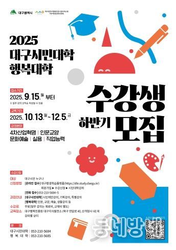 동네방네 김형규 기자 | 대구광역시는 오는 9월 15일부터 ‘2025 하반기 시민대학․행복대학’ 수강생을 모집한다. 이번 학기에는 시민대학 42개, 행복대학 36개 등 총 78개 강좌가 개설된다.