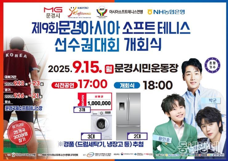 동네방네 김형규 기자 | 아시아소프트테니스연맹이 주최하고 제9회 문경아시아소프트테니스선수권대회 조직위원회가 주관하는‘제9회 문경아시아소프트테니스선수대회’가 9월 13일부터 23일까지 문경국제소프트테니스장 일원에서 11일간의 열전에 돌입한다.