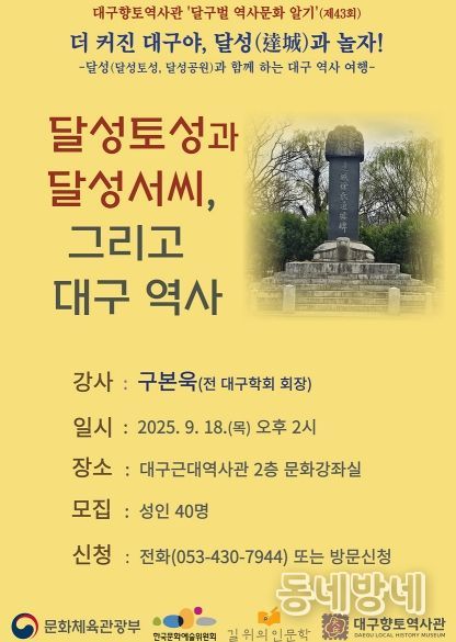 동네방네 김형규 기자 | (재)대구문화예술진흥원 박물관운영본부 소속 대구향토역사관은 9월에 달성토성과 달성서씨, 대구 역사를 주제로 ‘달구벌 역사문화 알기’ 특강과 답사를 2회 개최한다.