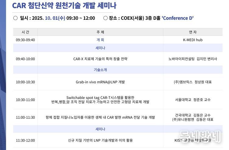 기술 분야로 정상원 ㈜엠브릭스 대표, 정준호 서울대학교 교수, 김동은 건국대학교 교수가 각 ▲Grab-in vivo mRNA@LNP 개발 ▲Switchable tag CAR-T시스템 활용 고형암 치료제 개발 ▲항체 접합 지질나노입자를 이용한 생체 내 CAR 발현 mRNA 전달 기술 개발을 발표한다.