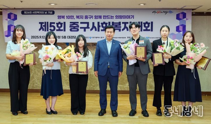 동네방네 김형규 기자 | 대구 중구는 12일 구청 대강당에서 제26회 사회복지의 날(9월 7일)과 사회복지주간을 기념해 사회복지 증진에 이바지한 종사자들의 노고를 격려하고, 2026년 시행 예정인 통합돌봄사업의 성공적 추진을 위한 ‘제5회 중구사회복지대회 및 통합돌봄 민관협력 세미나’를 개최했다.