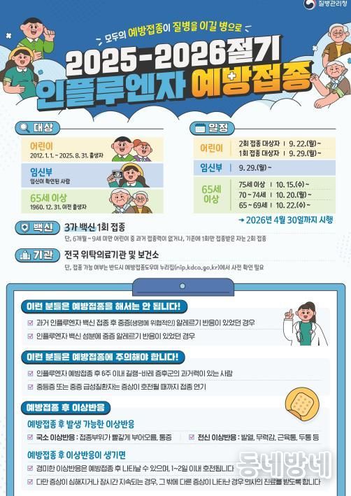 우선 22일 2회 접종 대상 어린이를 시작으로, ▲9월 29일, 어린이(1회 접종 대상)와 임신부 ▲10월 15일, 75세 이상 어르신 ▲10월 20일, 70~74세 어르신 ▲10월 22일, 65~69세 어르신의 접종이 이뤄지며, 모든 대상군 접종은 2026년 4월 30일까지 이어질 예정이다.