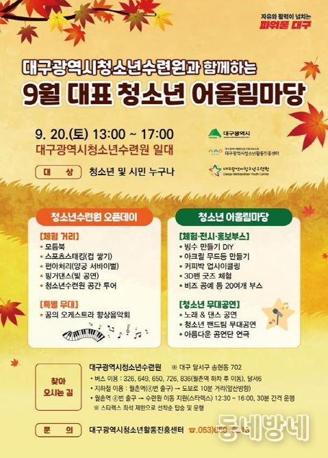 동네방네 김형규 기자 | 대구광역시는 9월 20일 오후 1시, 청소년수련원에서 ‘청소년 어울림마당’ 연 5회 행사 중 세 번째로 열리는 특별한 ‘오픈데이’를 개최한다.