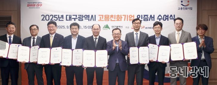 동네방네 김형규 기자 | 대구광역시는 9월 29일 오후 3시, 시청 산격청사에서 ‘2025년 고용친화기업 인증서 수여식’을 열고, 고용 창출 및 근무환경이 우수한 고용친화기업 신규 5개사와 재인증 6개사를 선정해 인증서를 수여했다.