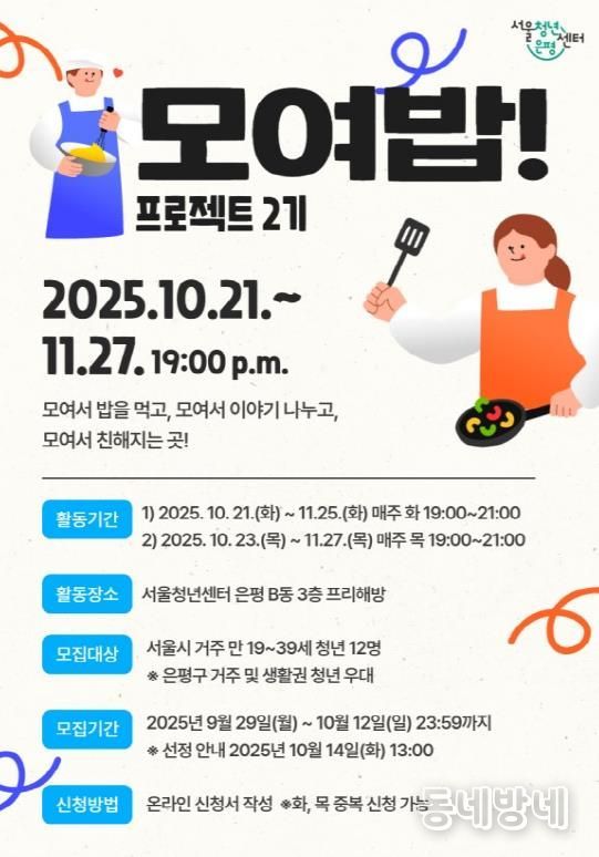 동네방네 김형규 기자 | 서울 은평구는 서울청년센터 은평이 요리와 봉사를 결합한 청년 커뮤니티 프로그램 ‘모여밥’의 2기 참여 청년을 오는 12일까지 모집한다고 밝혔다.