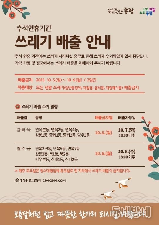 동네방네 김형규 기자 | 중랑구는 다가오는 추석 연휴인 10월 3일부터 9일까지, 구민들이 건강하고 쾌적한 명절을 보낼 수 있도록 응급의료 서비스와 쓰레기 처리 대책을 동시에 추진한다.