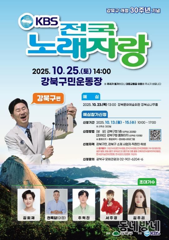 동네방네 김형규 기자 | 강북구는 개청 30주년을 기념해 오는 10월 25일 오후 2시 강북구민운동장에서 KBS 장수 예능 프로그램 ‘전국노래자랑’ 강북구편을 개최한다고 밝혔다.