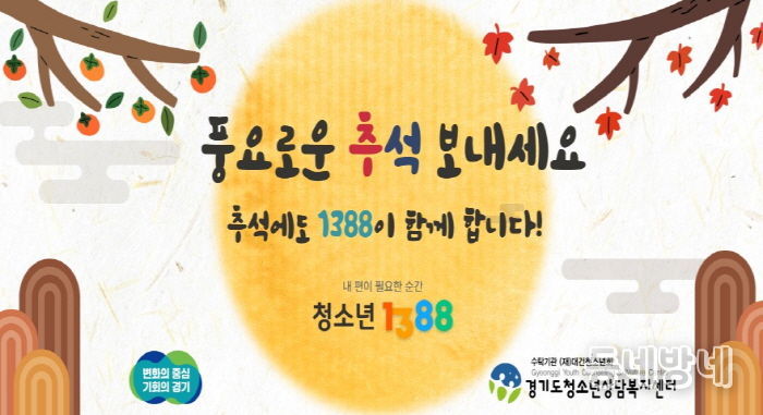 동네방네 김형규 기자 | 경기도는 개천절과 추석, 한글날이 이어지는 10월 3일부터 9일까지 연휴 기간에도 ‘청소년전화 1388’을 24시간 운영해 위기 청소년 상담과 발견·구조 서비스를 지원한다고 1일 밝혔다.