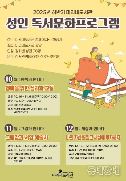 동네방네 김형규 기자 | 원주시 미리내도서관은 지역 시민들의 문화적 접근성을 높이기 위해 성인을 대상으로 하반기 독서문화프로그램을 운영한다.