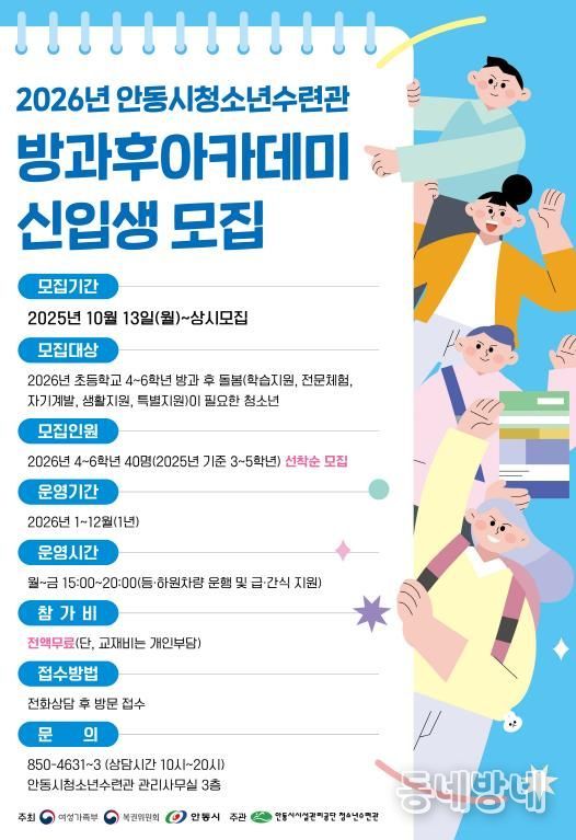 동네방네 김형규 기자 | 안동시시설관리공단이 운영하는 청소년수련관 방과후아카데미가 오는 10월 13일부터 2026년도 신입생 모집을 시작한다.