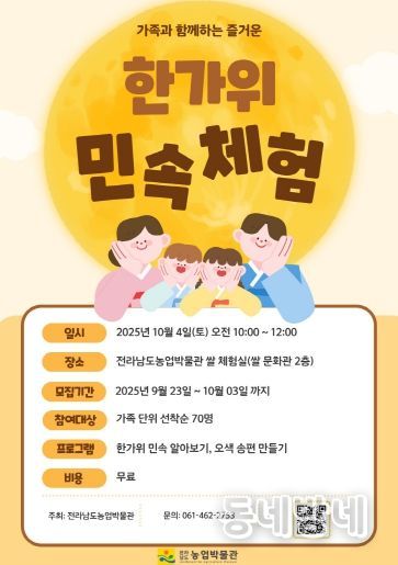 동네방네 김형규 기자 | 전라남도 농업박물관은 다가오는 한가위를 맞아 가족 단위 관람객 대상으로 ‘한가위 민속 체험행사’를 10월 4일에 개최한다고 밝혔다.