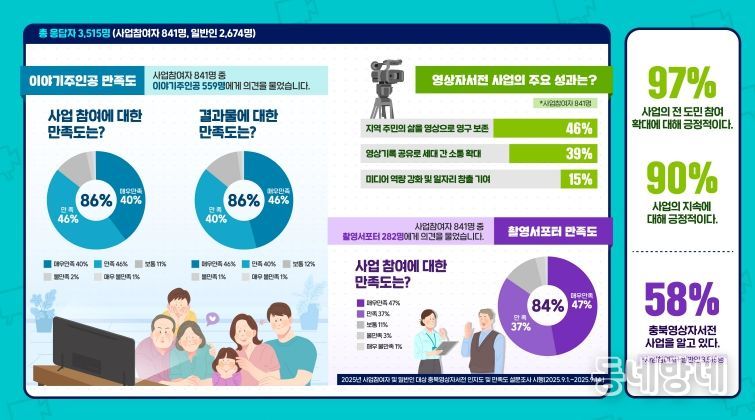 도는 지난 9월 1일부터 14일까지 2주간 실시한 ‘2025년 충북영상자서전 사업인지도 및 만족도’ 조사 결과를 발표하면서 “콘텐츠 제작 2만 5천 건을 돌파한 양적 성장에 이어 이제는 질적 성장도 입증됐다”고 밝혔다.