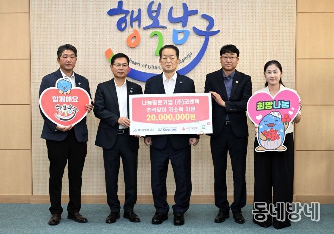 동네방네 김형규 기자 | ㈜코엔텍(대표이사 김재일)은 1일 남구청을 방문해 추석을 맞아 남구 관내 저소득층을 위한 후원금 2,000만 원을 전달했다.