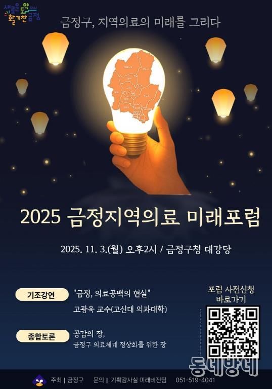동네방네 김형규 기자 | 부산시 금정구는 오는 11월 3일 금정구청 1층 대강당에서 침례병원 파산 이후 지속되어 온 지역 의료공백 문제를 논의하고 의료체계 정상화 방안을 모색하기 위해 '금정 지역의료 미래 포럼'을 개최한다.