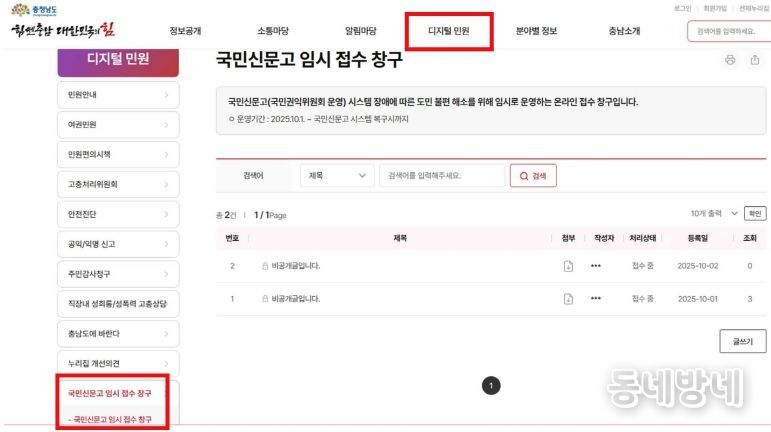 동네방네 김형규 기자 | 충남도는 2일부터 도 누리집에 ‘국민신문고 온라인 임시 접수 창구’를 개설·운영하고 있다고 밝혔다.