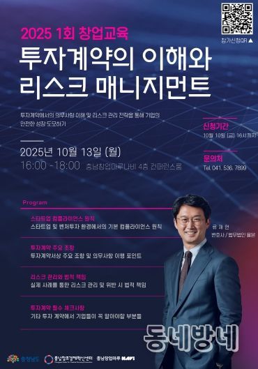 교육은 2025년 10월 13일 충남창업마루나비에서 진행되며, 류재언 변호사(법무법인 율본)가 강사로 참여해 스타트업 컴플라이언스 원칙, 투자계약 주요 조항, 리스크 관리 및 법적 책임, 투자계약 필수 체크사항 등을 상세히 강의할 예정이다.