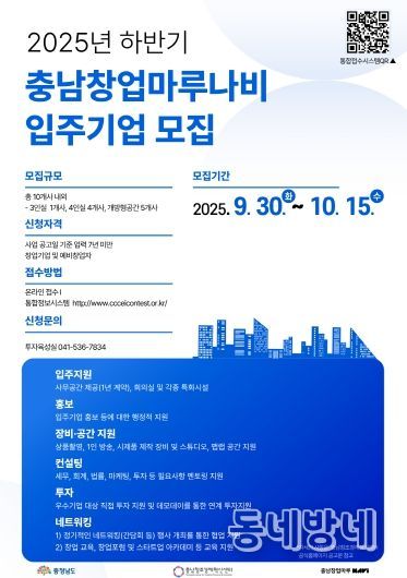동네방네 김형규 기자 | (재)충남창조경제혁신센터는 오는 10월 15일까지 2025년 하반기 충남창업마루나비 입주기업을 모집한다고 밝혔다. 이번 모집은 혁신적인 아이디어와 성장 잠재력을 지닌 스타트업을 발굴해 안정적인 보육 환경을 제공하고, 기업의 지속적인 성장을 지원하기 위해 추진된다.