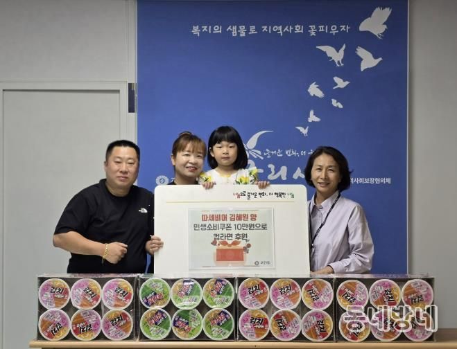 동네방네 김형규 기자 | 구리시 교문1동 행정복지센터는 지난 10월 1일, 관내 식당 따세비어의 딸 김혜원(5세) 양이 민생 소비 쿠폰 10만 원으로 마련한 컵라면 17박스를 어려운 취약계층에 전달하기 위해 기탁했다고 밝혔다.