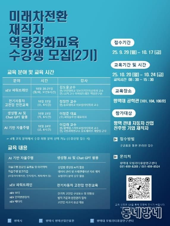 동네방네 김형규 기자 | 평택시와 평택산업진흥원이 ‘미래차 전환 재직자 역량 강화교육’ 2기 과정을 개설한다. 교육은 10월 20일부터 24일까지 교육 운영기관인 평택대학교에서 진행되며, 지역 자동차 산업 재직자를 대상으로 미래차 핵심 분야 전문지식을 제공한다.