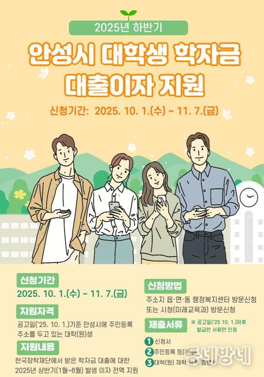 동네방네 김형규 기자 | 안성시는 오는 10월 1일부터 11월 7일까지 ‘2025년도 하반기 안성시 대학생 학자금 대출이자’ 지원 신청을 받는다.