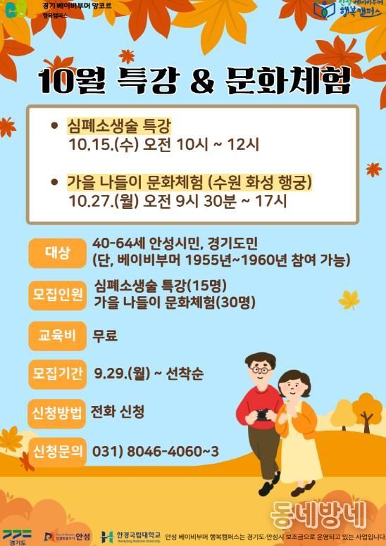 동네방네 김형규 기자 | 안성 베이비부머 행복캠퍼스(한경국립대학교 평생교육원)는 오는 10월 15일부터 27일까지 중장년 안성시민(경기도민)을 대상으로 ‘10월 특강(심폐소생술) 및 문화체험(수원화성행궁)’ 프로그램을 운영한다고 밝혔다.