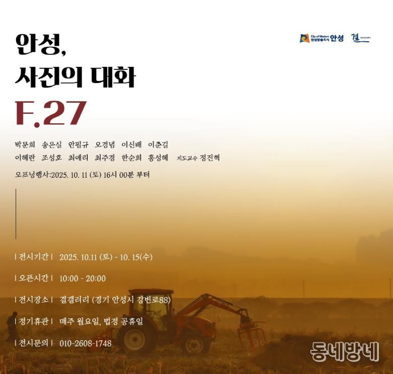 동네방네 김형규 기자 | 안성시 사진동아리 F.27 photo가 오는 10월 11일부터 15일까지 안성천 작은미술관 결갤러리에서 전시회 ‘안성, 사진의 대화 F.27’을 개최한다. 이번 전시는 동아리 회원 18명이 참여해 안성의 자연환경과 사람들의 이야기를 기록한 작품을 선보인다.