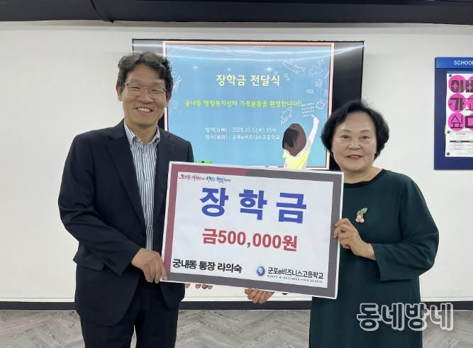 동네방네 김형규 기자 | 라의숙 군포시 궁내동통장협의회장은 10월 1일 군포e비즈니스고등학교에 장학금을 전달하며 지역 청소년들의 꿈을 응원하는 뜻깊은 나눔을 실천했다.