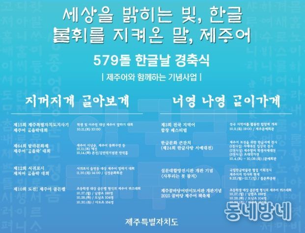 동네방네 김형규 기자 | 제주특별자치도는 훈민정음 반포 579돌 한글날을 맞이해 오는 9일 오전 10시 제주문예회관에서 한글날 경축식을 개최한다.