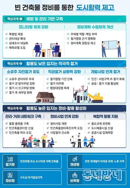 이에, 국토부는 ➊예방 및 관리 기반 구축, ➋활용도 낮은 빈 건축물의 적극적 철거, ➌활용도 높은 빈 건축물의 정비·활용 활성화 등 빈 건축물의 입체적 정비방안을 마련했다.